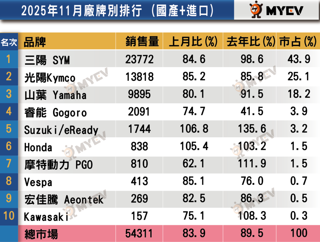 隨著進入2025年尾聲,在歷經暑期購車旺季後,11月份臺灣機車總市場掛牌數降至54,311輛,較10月衰退16.1%,較去年同期衰退10.5%,為今年度第三低(僅高於1月與4月)。雖然市場整體熱度下降,但仍有部分品牌與車款表現亮眼,尤其是Suzuki與Honda為Top 10品牌中少數銷量正成長者。