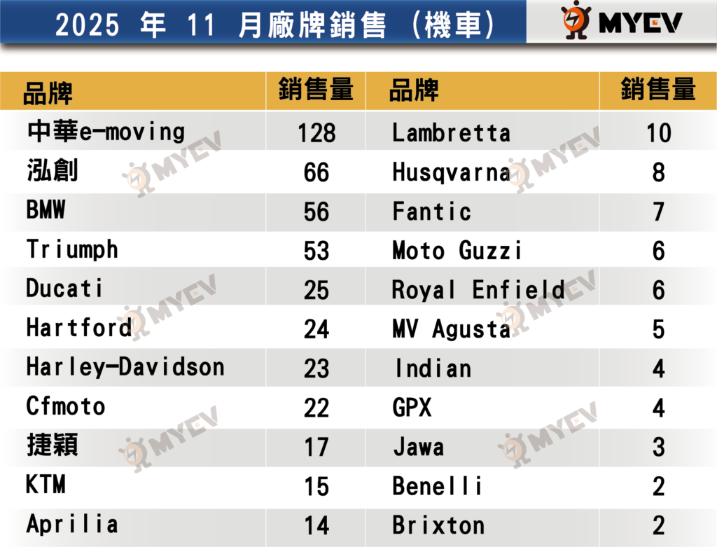 在整體市場銷量衰退下,Suzuki11月掛牌1,742輛,較10月及去年同期分別成長6.1%與35.5%,主要貢獻來自電動車eReady Fun(掛牌274輛)及高檔檔車DR-Z4S/DR-Z4SM;Honda掛牌818輛,較10月提升5.4%,以微幅優勢超越PGO(818輛),名次上升1席。相對地,Vespa掛牌數不足500輛,較10月衰退14.9%,宏佳騰Aeontek掛牌269輛,衰退17.5%,Kawasaki雖下滑24.9%,仍以29輛差距守住第10名,整體市場競爭激烈,傳統油車與電動車雙線作戰持續拉鋸。