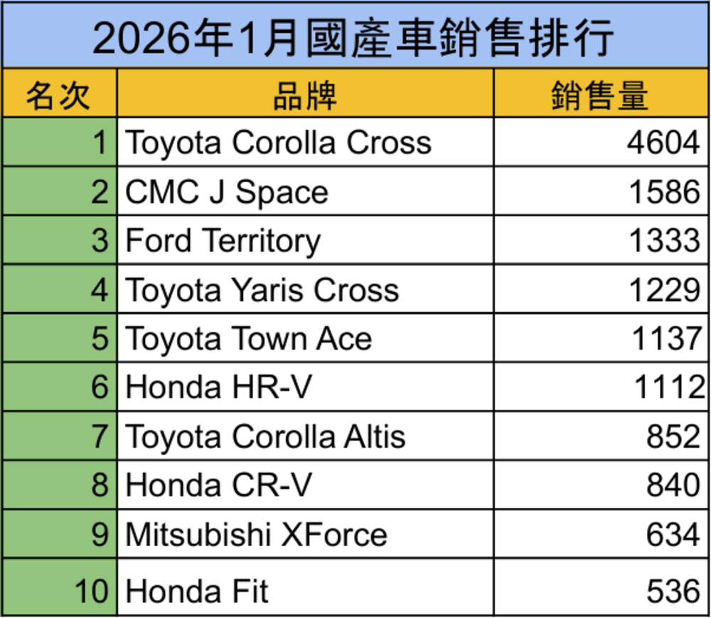 1月國產車銷售表現穩健,未見明顯波動,持續扮演整體市場的穩定器角色。受惠於汰舊換新與貨物稅補助政策延續,中小型休旅與高CP值車款仍為主流選擇。