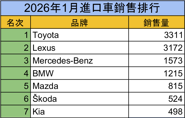 在一般進口車領域,Toyota、Kia 等品牌仍是市場主力;豪華進口車則呈現「高端需求穩定、交付節奏保守」的特徵,市場量能未再現年底放量走勢。