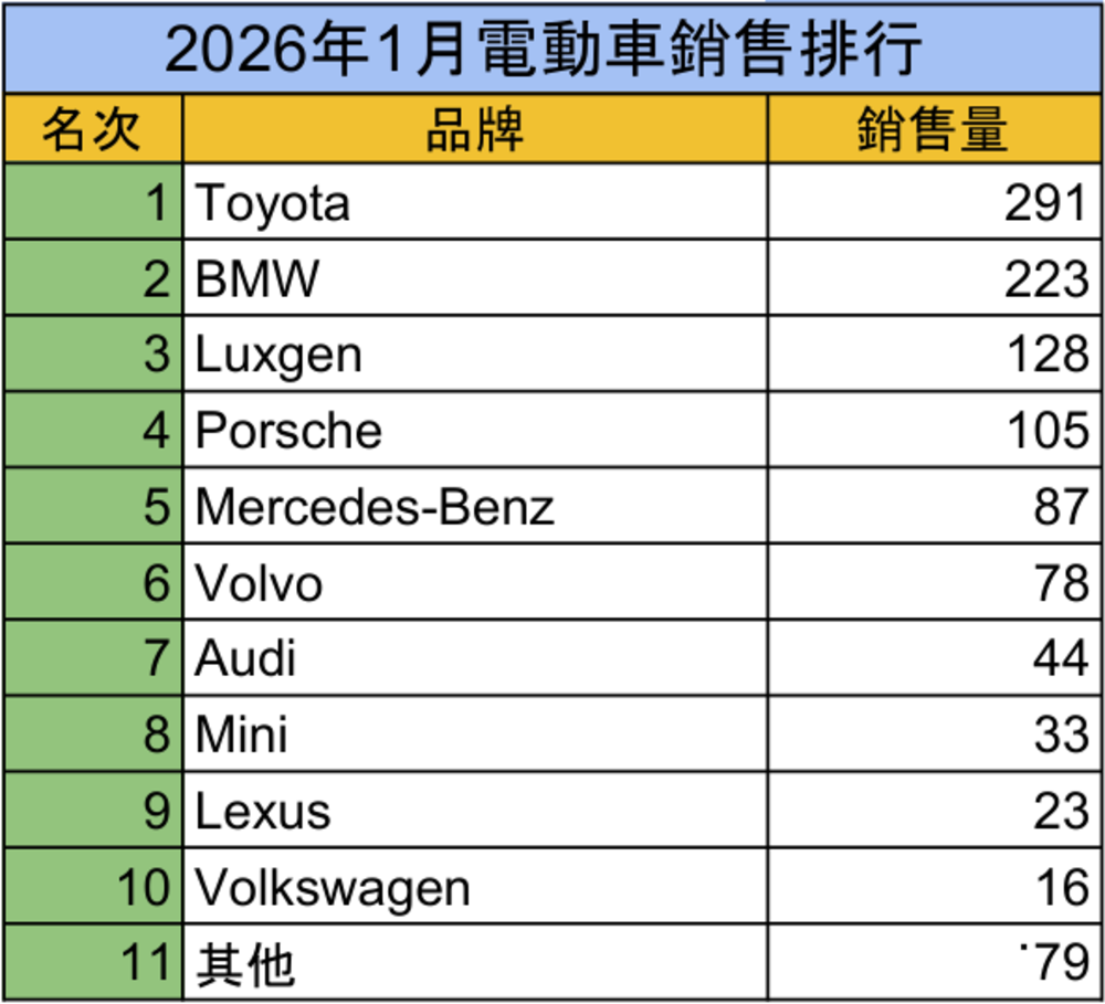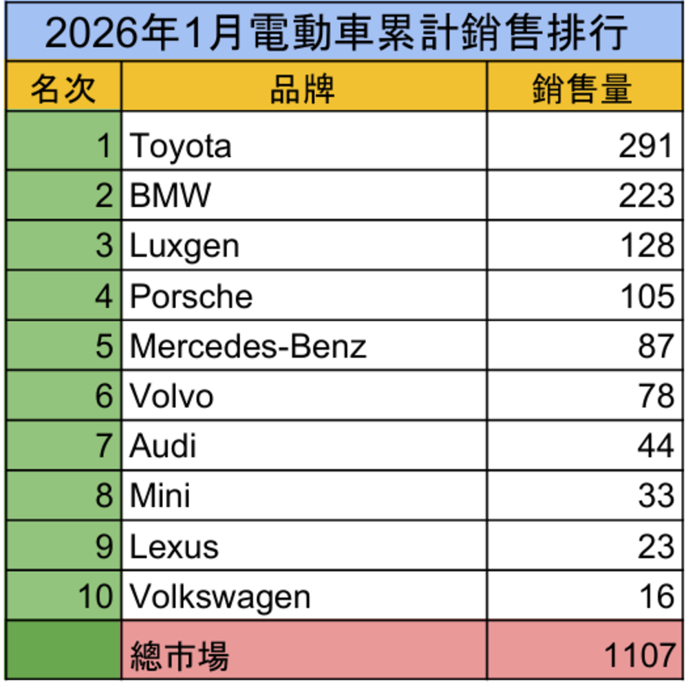 整體而言,2026年1月車市表現屬於年底高峰過後的自然修正,而非需求急凍。國產車持續支撐基本盤,進口車與電動車則受交車節奏影響出現短期波動。